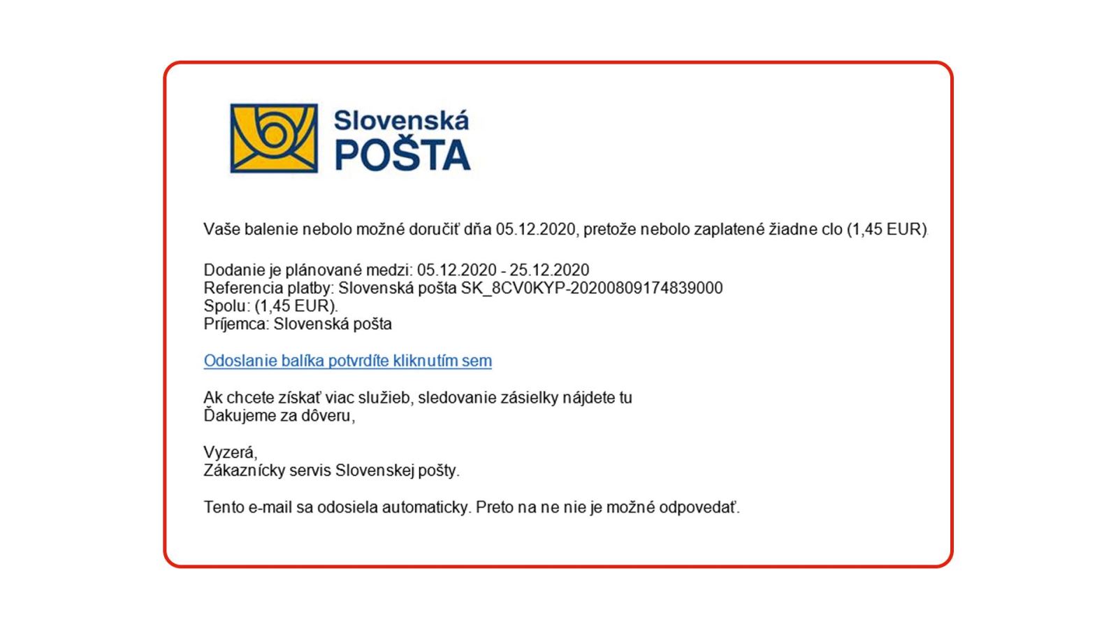 E-mail sa môže tváriť ako oficiálny, ale adresa odosielateľa môže vyzerať napríklad takto: